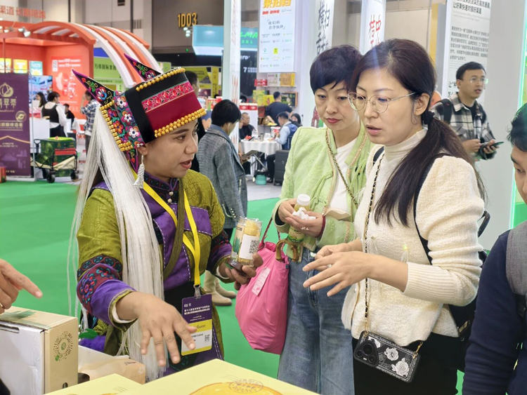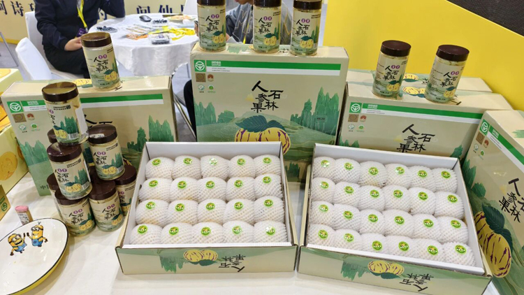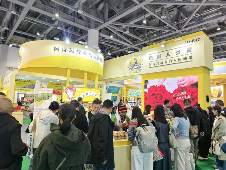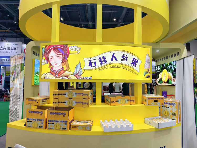 走進展館,石林人參果展位因濃濃的“阿詩瑪風情”成為全場亮點。金黃飽滿的人參果、果干、果脯等整齊擺放,展廳里循環播放的視頻里,紅土地上掛滿果實的果樹生機勃勃,客商紛紛駐足拍照。