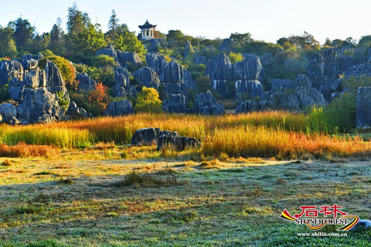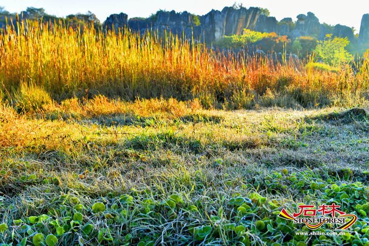 石林冬天的氣溫大半維持在10攝氏度以上,賦予了大地永恒的綠色。 霜花凝結在草地上,草叢將枯未枯,總有新綠抬頭壓下那枯萎的蕭瑟,於是便保有著如春天般的綠意,青黑色的石海即刻鮮活而靈動。