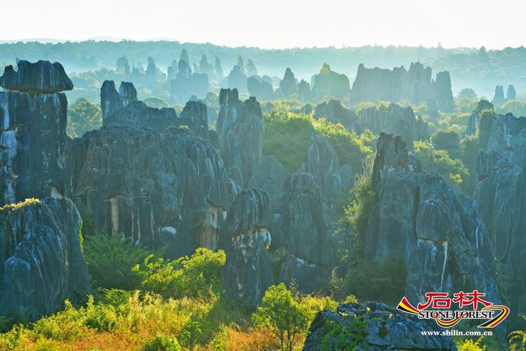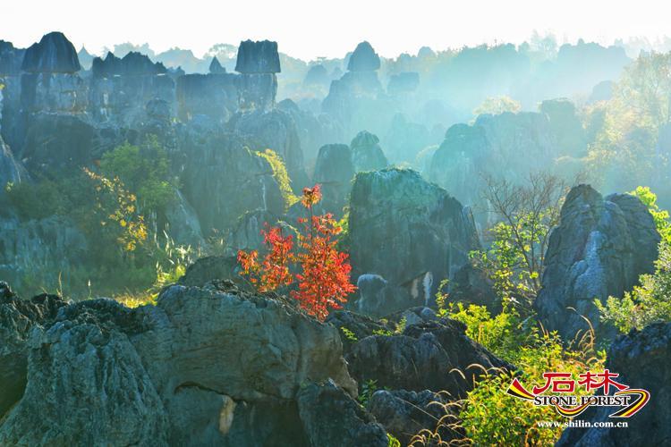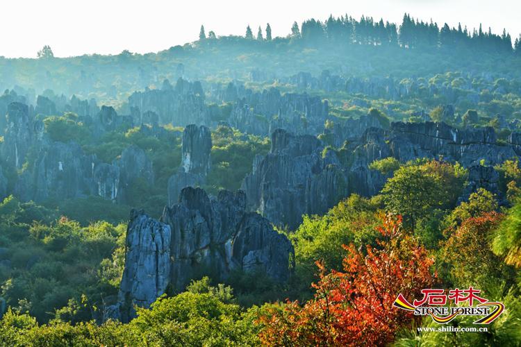 冬日清晨七點,天剛漏出一抹淺青,石林已裹著薄霧蘇醒。 輕霧似雲絮般的薄紗,漫過灰黑色的岩柱群,將棱角分明的石峰暈成朦朧的剪影,像是宣紙上暈開的淡墨,又因了秋冬霜葉和朝陽的上色,添出幾分西洋油畫的厚重質感。