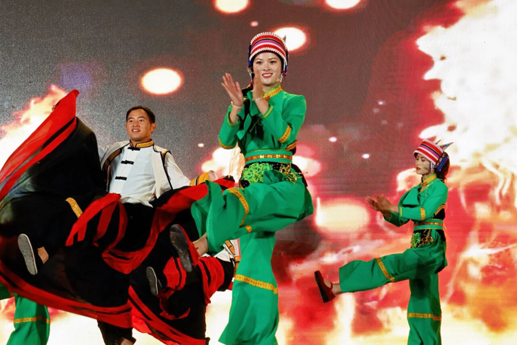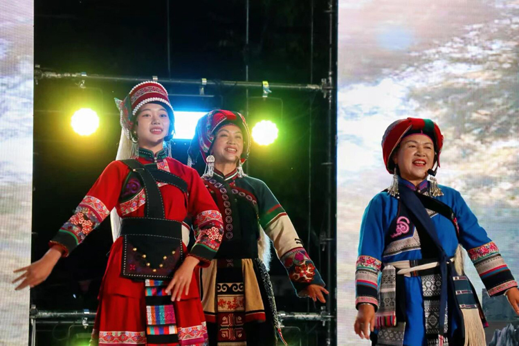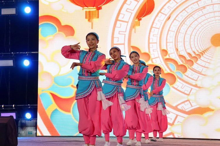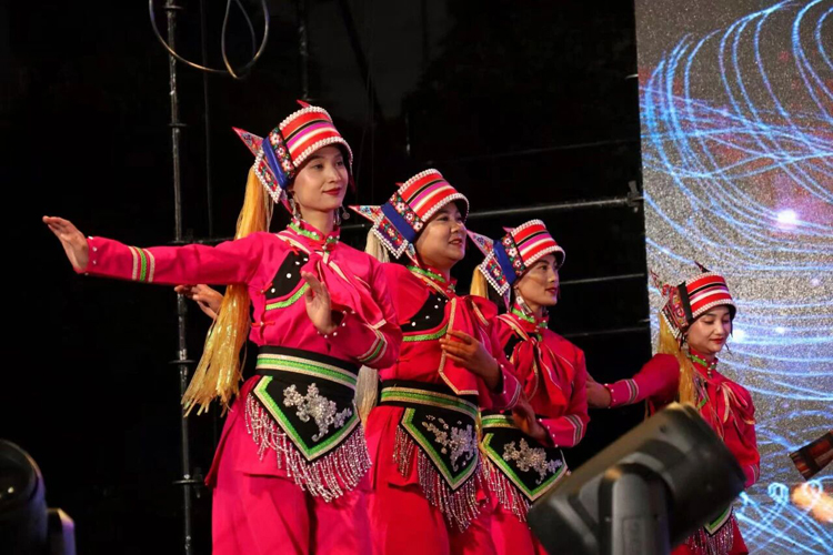 隨後上演的彝族撒尼舞蹈《歡迎您到石林來》,將現場氣氛推向高潮。 舞者們身著鮮豔的民族服飾,伴隨大三弦與月琴的悠揚合奏翩然起舞,裙擺隨風飛揚,彩虹包頭上的銀飾清脆作響。 舞姿中既有石林奇石的嶙峋神韻,又巧妙融入了“阿詩瑪”與“阿黑哥”的動人傳說。