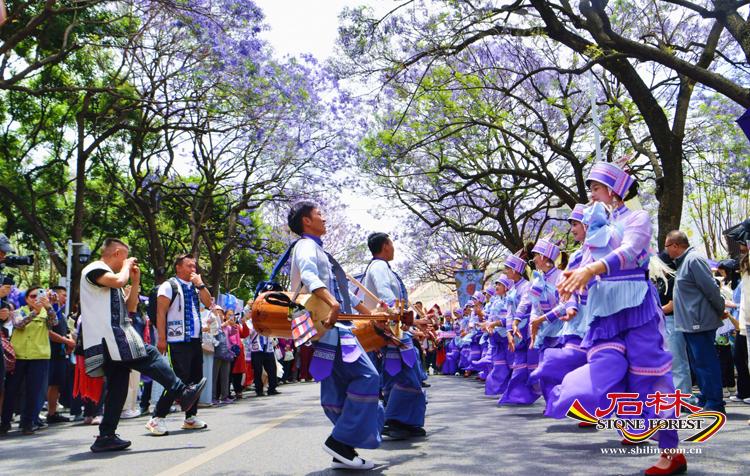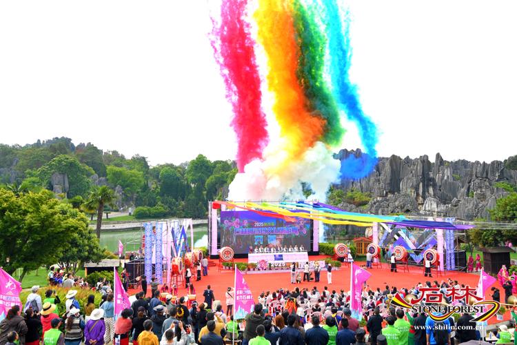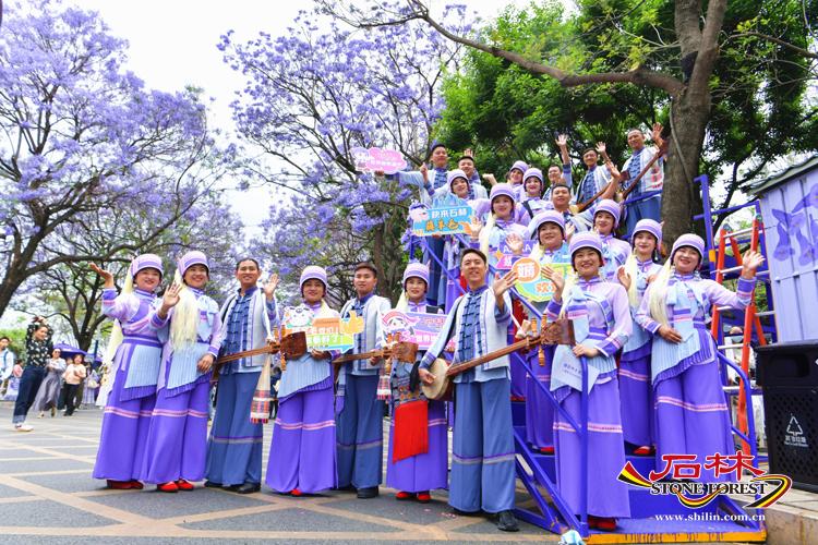“撒尼奇韻迎遠客,一脈風情待君來”阿詩瑪迎賓巡遊,從迎賓廣場出發,途經石林湖、遺產石、抵達日月廣場。 身著絢麗服飾的撒尼人,以歌舞與笑容迎接遊客,濃郁的民俗文化氛圍撲面而來。 迎賓廣場“烟火匯石海,技藝暖人間”阿詩瑪非遺文化集市,彙聚了刺繡、木雕、彩玉等精美手工藝品和土特產品,手工藝人現場展示製作,遊客可體驗、選購,感受非遺魅力。 日月廣場、蓮花池、天然舞場同步開展的“千年烟火凝一瞬,醉人彝風綻芳華”阿詩瑪生活片段展演,民俗大聯歡、電影片段對歌、民俗接親表演,為遊客帶來沉浸式文化盛宴,現場氣氛熱烈。 此外,“花楹織綺夢,靚影秀春城”阿詩瑪走進藍花楹快閃活動,在昆明市教場中路、藍花楹主題公園沿線、南屏街驚豔亮相,絢麗服飾與藍花楹美景交融,廣泛傳播石林阿詩瑪文化。