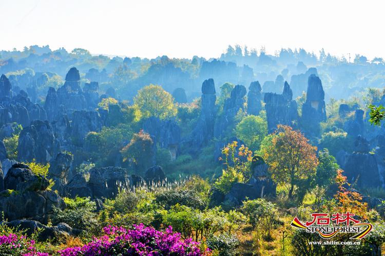 冬日清晨七點,天剛漏出一抹淺青,石林已裹著薄霧蘇醒。 輕霧似雲絮般的薄紗,漫過灰黑色的岩柱群,將棱角分明的石峰暈成朦朧的剪影,像是宣紙上暈開的淡墨,又因了秋冬霜葉和朝陽的上色,添出幾分西洋油畫的厚重質感。