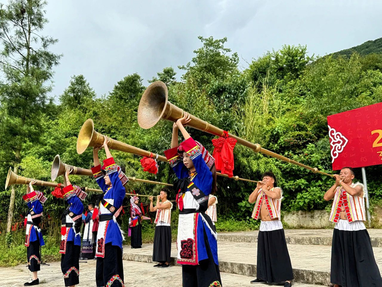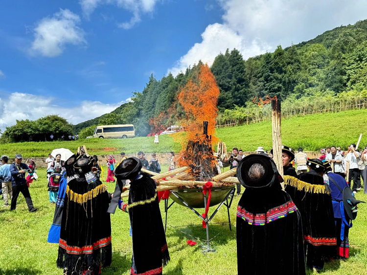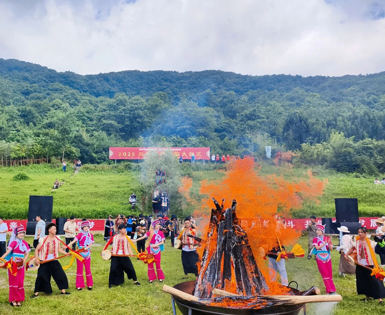 取火成功後,艺文隊伍吹響過山號,激昂的號聲在山谷回蕩,慶祝這一神聖時刻,標誌著火把節的重要序曲順利奏響。 畢摩們神情莊重,邁著穩健的步伐,將象徵希望與祝福的火把進行傳遞,大家共同點燃代表全縣人民火紅興旺的主火堆。 熊熊火焰瞬間騰起,照亮了整個場地,現場觀眾發出陣陣歡呼。