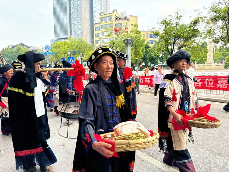 7月17日,農曆六月廿三,火把節前一天,從石林縣城到圭山國家森林公園,一場莊重肅穆的2025石林火把節“辭舊火·迎新火”儀式盛大舉行。 送舊火、取新火、迎新火……石林縣再現火把節傳統“火鐮擊燧石”的神聖典禮,延續遠古先人留下的傳統取火管道,採集火把節的火種,意蘊文明之光薪火相傳。