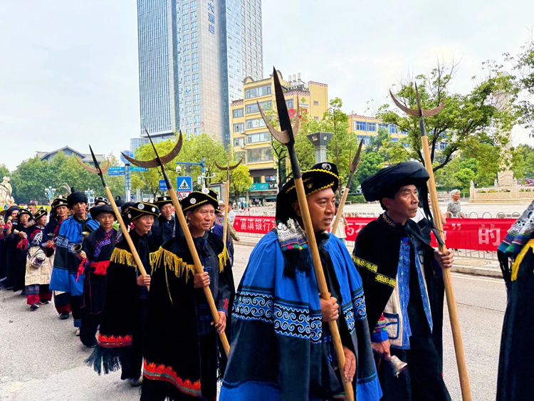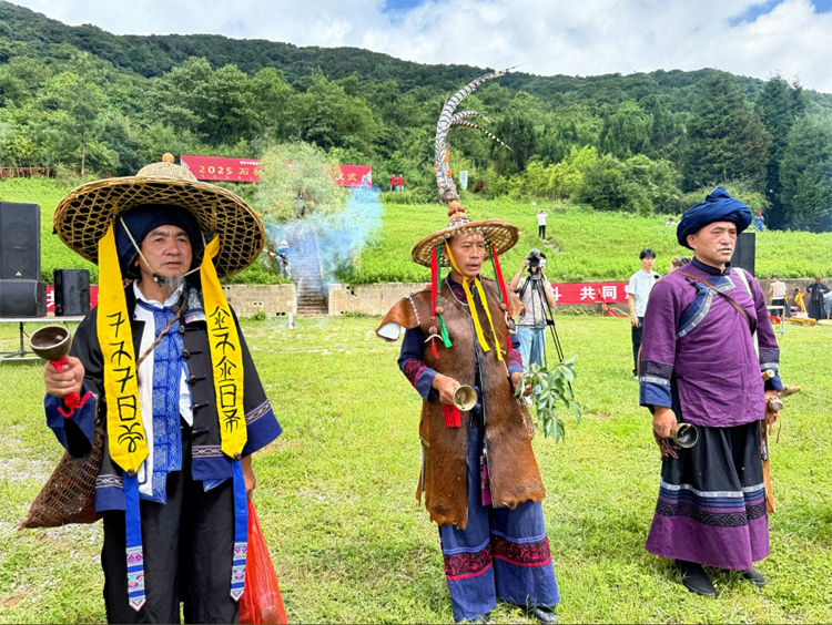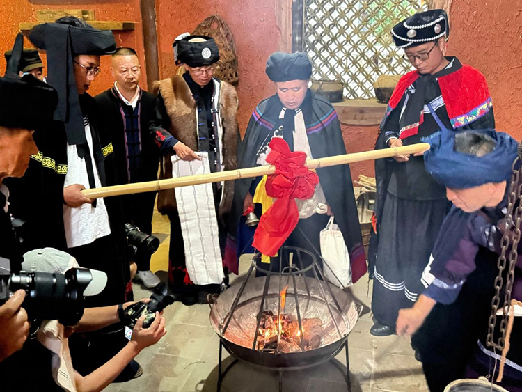清晨,由身著畢摩服飾的畢摩長者,懷着對“火神”的敬畏和崇拜,持著法器,手托祭品,伴著空曠的銅鑼聲,邁著沉穩而整齊的步伐,口中吟誦著古老的祝詞,護送舊火前往圭山,寓意著告別過去一年的災禍與不順,祈求新的一年平安順遂。 隨著喜炮驟然炸響,清脆而悠長的銅鑼聲隨即回蕩開來。 整個過程井然有序,每一個環節都透著對傳統習俗的深切敬畏,盡顯儀式的莊嚴與神聖。