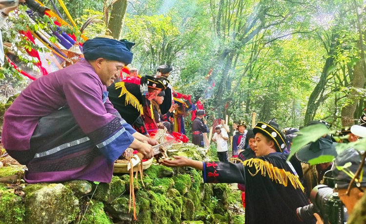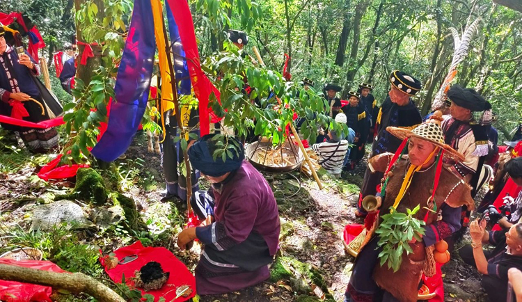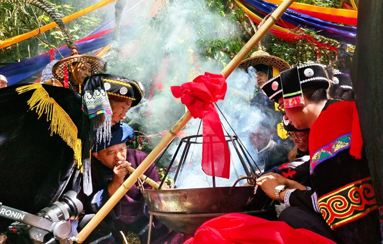 舊火護送隊到達圭山國家森林公園,取火儀式正式開始。 畢摩們通過清潔門,掃除身上的不潔之物,沿著通向“天火壇”的石階而上,漸入神聖的“天火壇”境地。 “天火壇”設在密林深處,古木蒼翠,怪石嶙峋,顯得純淨而神聖。