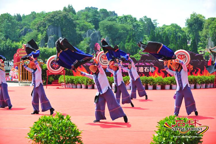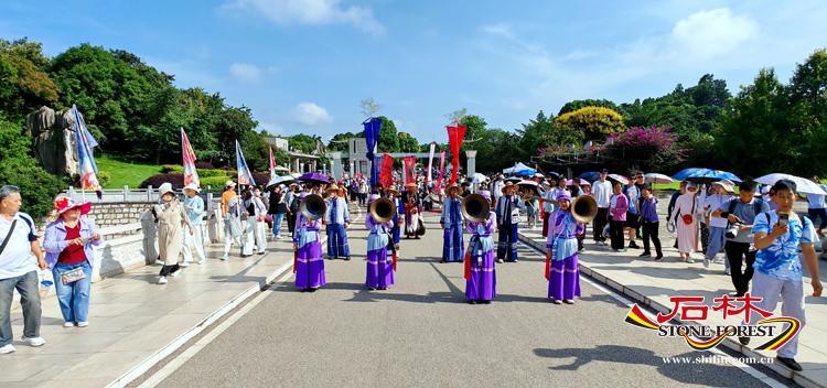 祭火儀式的餘溫尚未散去,舞臺便被文藝演出的活力點燃。 石林藝術團與民間藝術團輪番登場,將彝鄉文化精髓融進每一個音符與舞步。 鼓點鏗鏘,絢麗服飾的舞者踏節而舞,脚步旋轉似與石林峰叢共振; 歌聲悠揚,帶著熱忱的旋律漫過廣場,引得遊客輕聲跟和; 阿詩瑪的經典舞姿綻放,與歡聲笑語交織成歌。